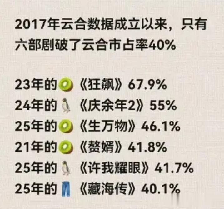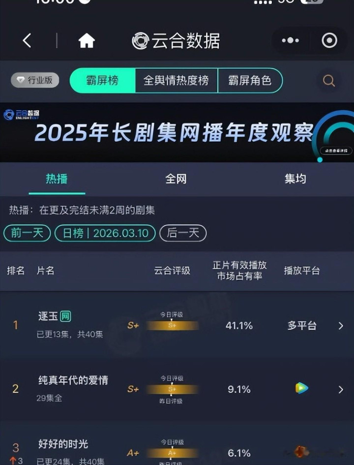 自2017年云合数据配置以来,单日市占率冲突40%的剧集仅有七部,这一数字背后,是不雅众用遥控器和流量投出的“爆款认证”。市占率40%意味着什么?它代表该剧在播出当日占据全网近半数的不雅看时长,是果真的“全民追剧”气候。从2018年的《延禧攻略》到2026年3月的《逐玉》,这七部剧无一不是话题、口碑与买卖价值的三重标杆。网友齰舌:“能破40%的剧,不是‘剧王’,即是‘气候’!”而《逐玉》以41.1%的最新收获登顶,更让行业有趣:在内容爆炸的今天,它凭什么成为“七年之痒”后的新冲突?