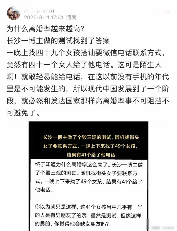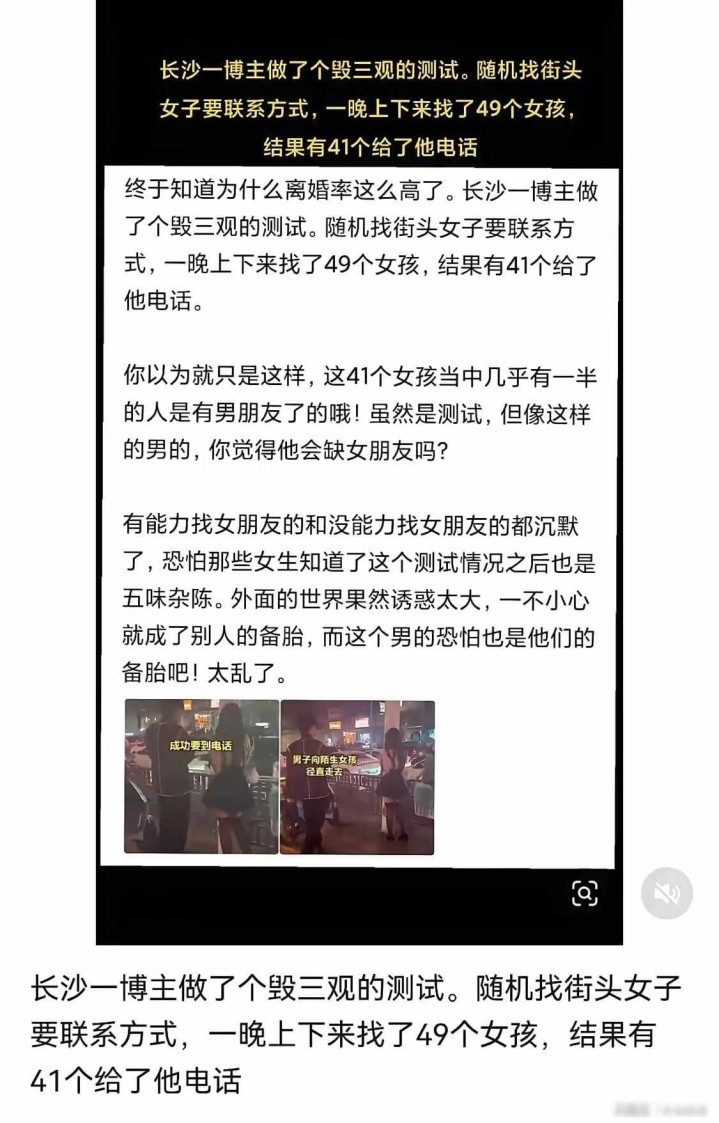 2025年的时刻,长沙有个博主拍了段视频,他在晚上跑到街上向49个女生要微信或电话号码,截至有41个东谈主给了关系表情,这个视频发出来后,好多东谈主就说当今的女性太大致了,婚配确定保不住,他们以为这件事评释了分离率会一直往高涨。