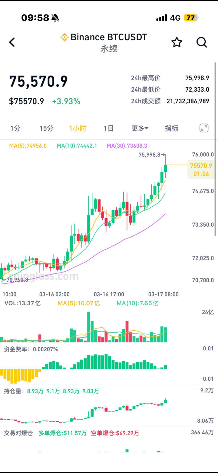 3月17日,比特币冲突75000好意思元,一度高涨到75998.8好意思元,创出近期高点。现在报75586好意思元,高涨3.97%。