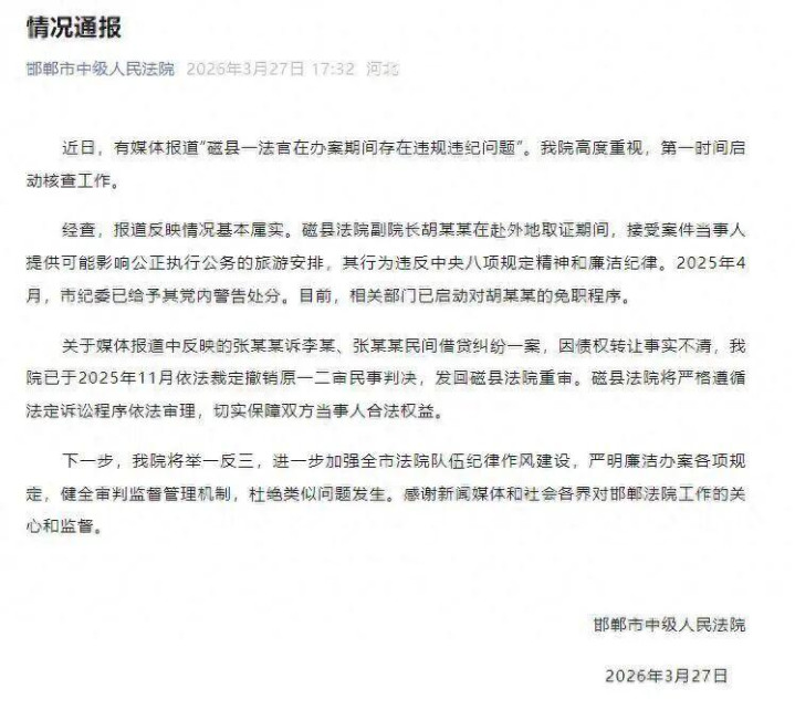 3月27日,邯郸市中级东说念主民法院通报“磁县一法官在办案时间存在违规违法问题”,全文如下: