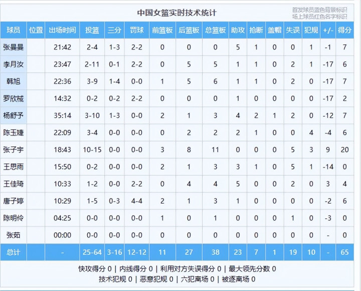 数据:张子宇20分11板、韩旭7分6板1助、杨舒予7分3板4助2断、张曼曼7分5助、李月汝6分5板1助、唐子婷6分3板1助、陈玉婕6分2板2助、王佳琦4分4板5助、罗欣棫2分1助、王念念雨3板3助