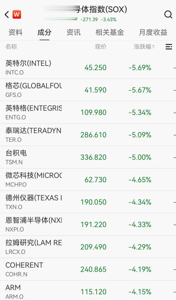 芯片股广大下降,费城半导体指数跌3.43%,英特尔跌超5%,台积电跌5%,微芯科技、德州仪器、恩智浦半导体跌超4%,超微半导体跌逾3%,好意思光科技跌超3%。