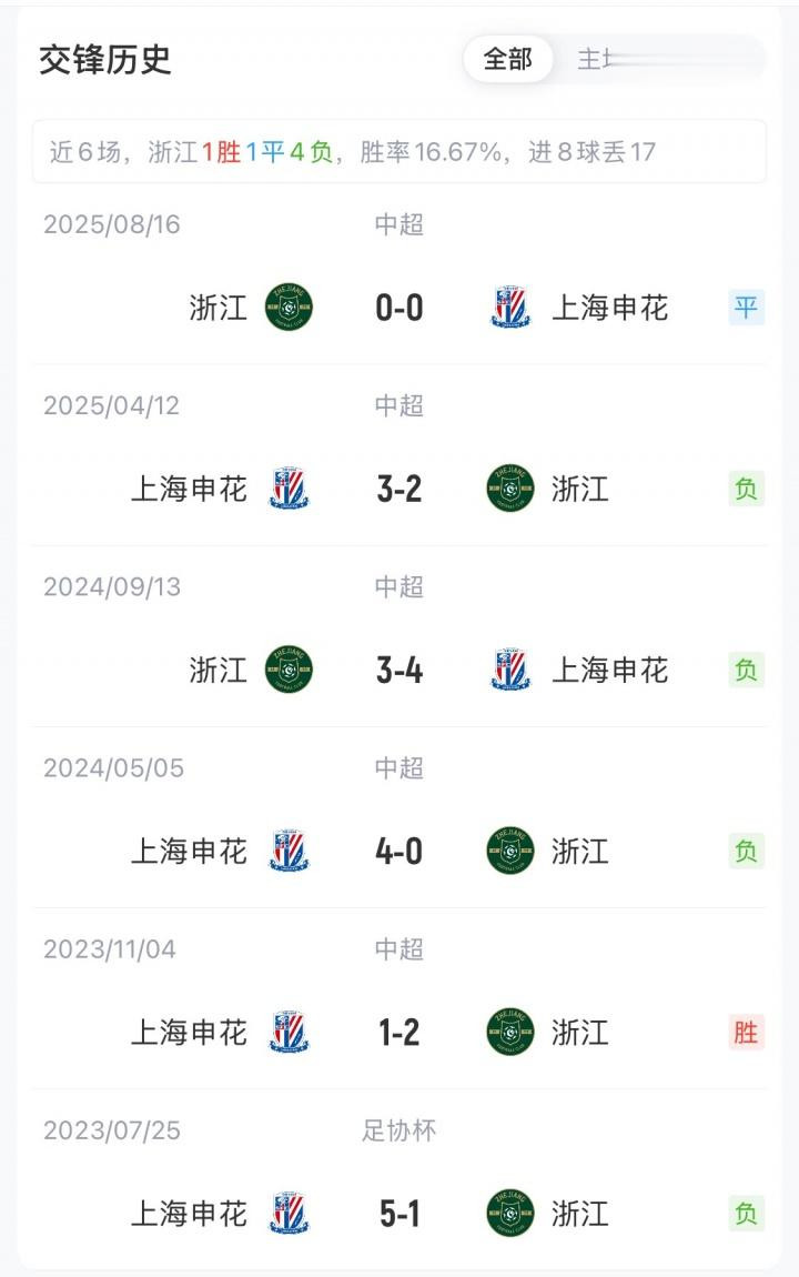 浙江vs申花近6场交锋战绩