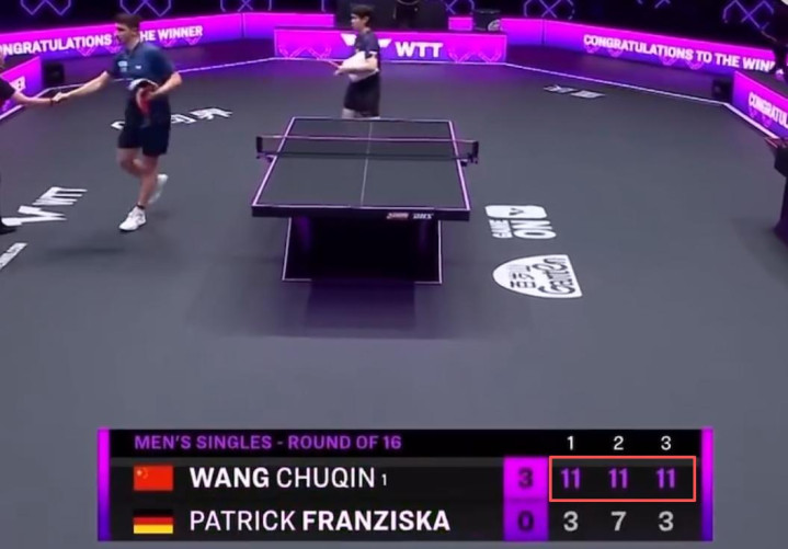 王楚钦连下三局零封敌手,全程仅用时18分钟。