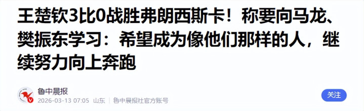 鲁中晨报|王楚钦3比0征服弗朗西斯卡!称要向马龙、樊振东学习:但愿成为像他们那样的东谈主,陆续发奋进取奔波