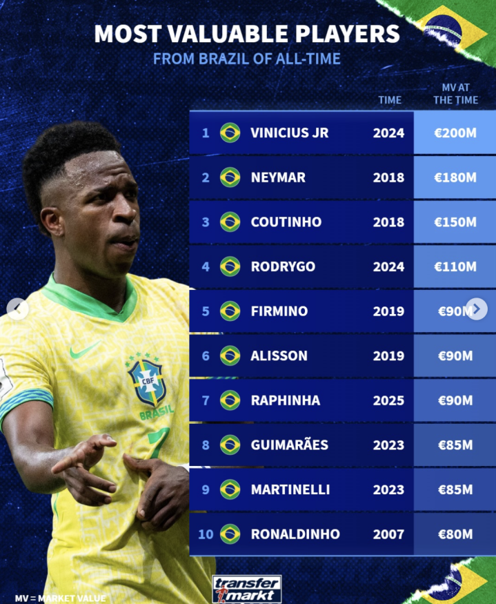虎扑03月31日讯德转统计了巴西球员历史身价最高榜。