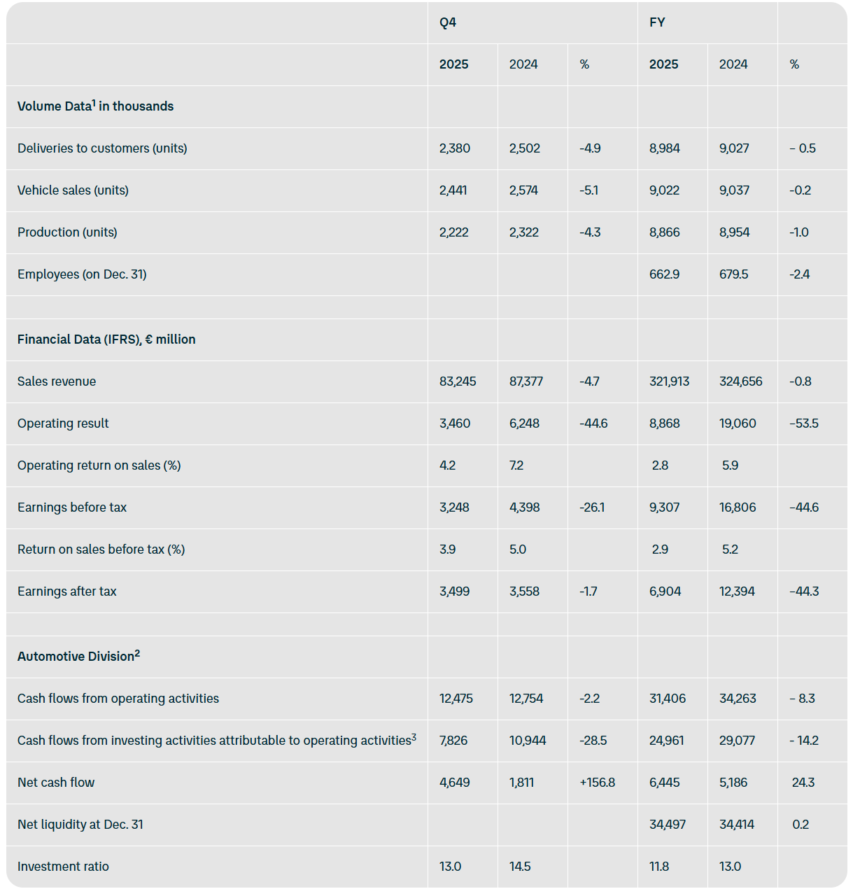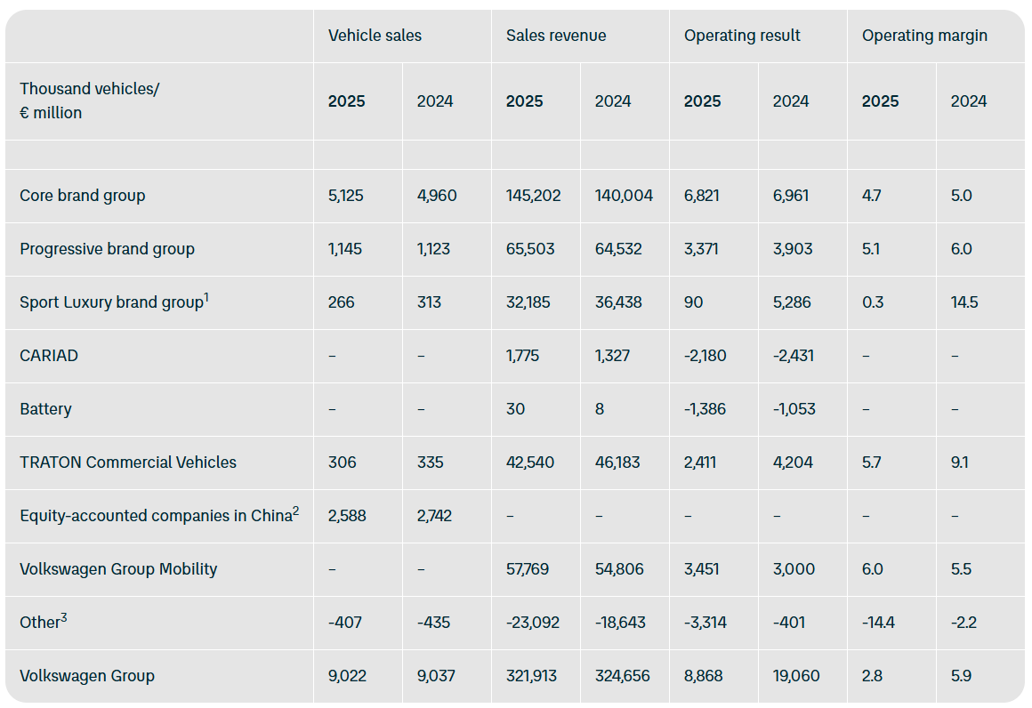 财报深切,人人汽车集团 2025 财年销售收入达 3219 亿欧元(IT之家注:现汇率约合 2.58 万亿元东谈主民币),与 2024 年的 3247 亿欧元基本握平;营业利润为 89 亿欧元(现汇率约合 714.07 亿元东谈主民币),比 2024 年的 191 亿欧元下落 53%,研讨呈报率为 2.8%,较 2024 年的 5.9% 有所裁汰。