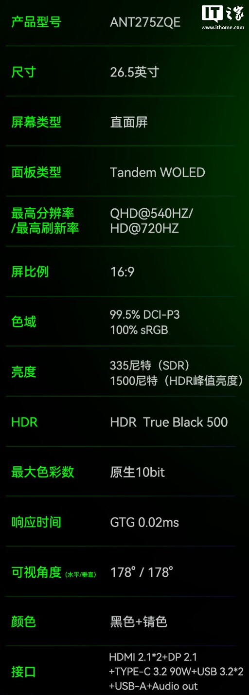 IT之家 3 月 10 日音讯,HKC 旗下蚂蚁电竞现已推出一款型号为“ANT275ZQE”的 27 英寸泄漏器,该机主打 2K 540Hz / 720P 720Hz,订价为 6999 元。