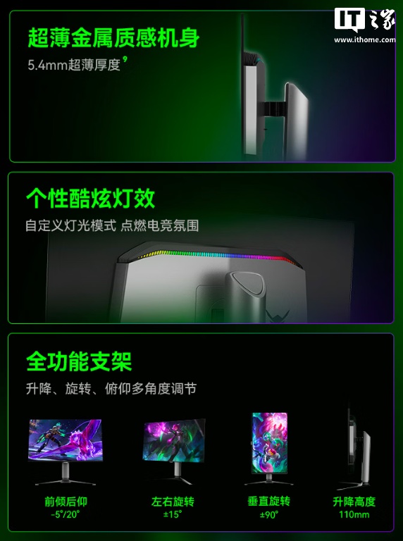 该机支架赞助升降 / 歪斜 / 旋转,机身后头提供 RGB 氛围灯,机身实质赞助 VESA 100x100mm 壁挂,提供 2 个 HDMI 2.1、1 个 DP 2.1、USB-C 90W、USB-A 3.2(KVM)接口。